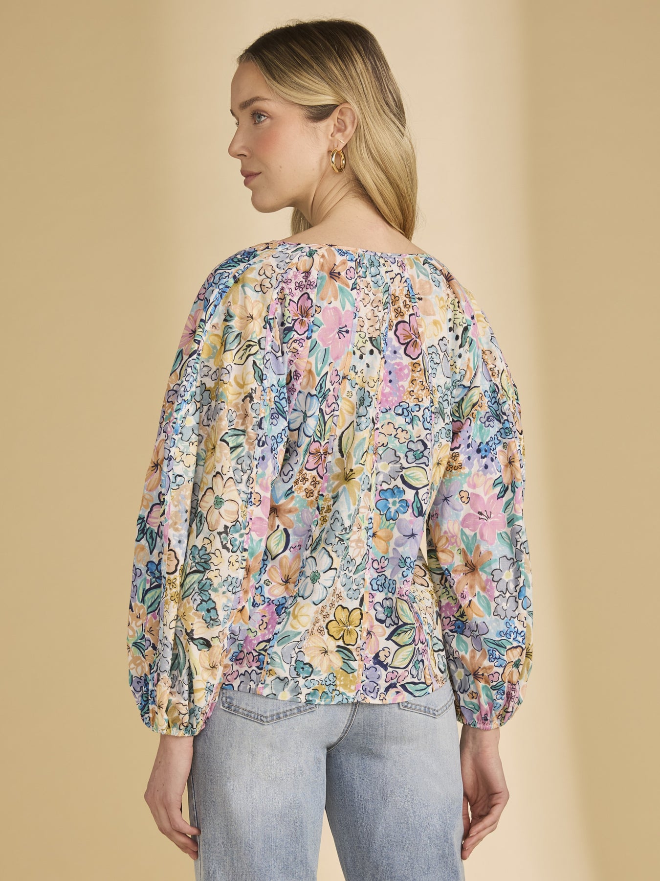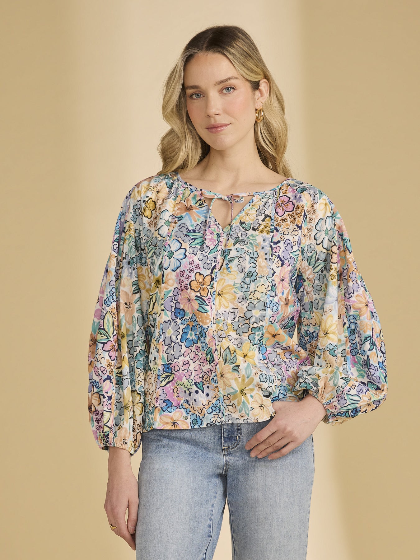 Versatile to wear with your favourite jeans, capris or coloured bottoms, this must have top is styled with a self-tie V-neck and puff sleeves with stretch cuffs that you can push up for fashionable balloon effect. Length is 24".