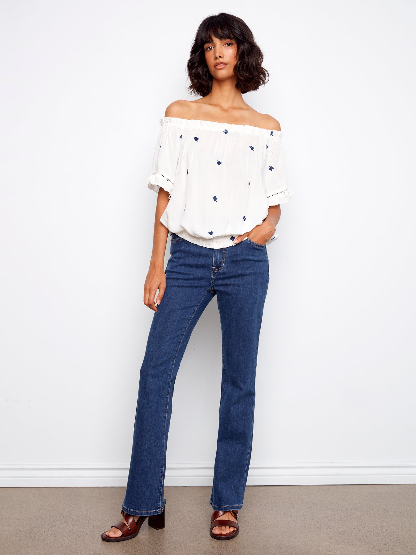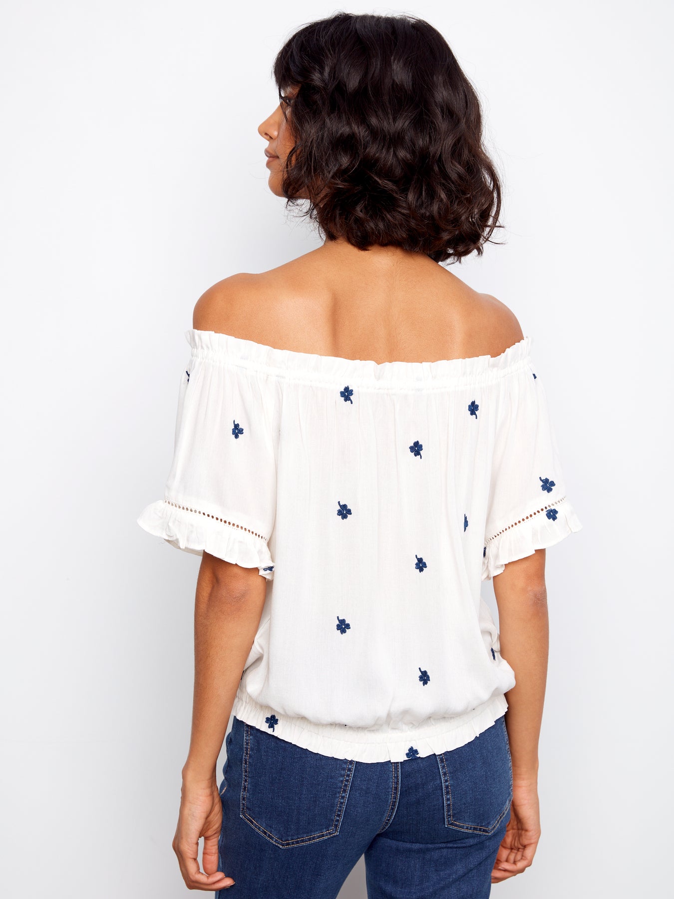Fashionable and chic blouse from Charlie B features a flattering off-shoulder design with ruffled short sleeves and an elasticized ruffled hem, styled with delicate embroidered flowers.