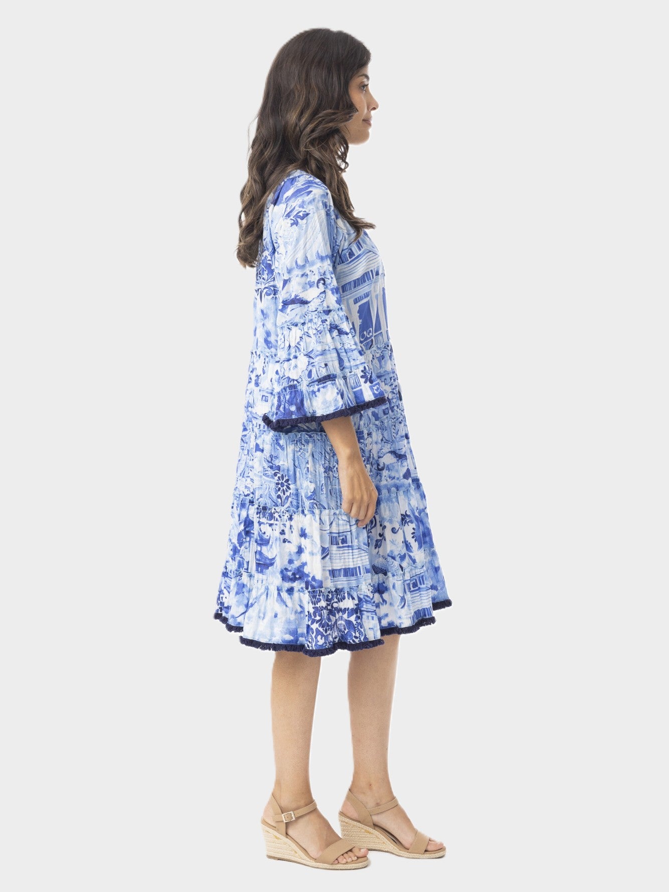Designed to make you feel special, the Okayama print dress in China blue has a round V-notched neckline with tassel tie detail and 3/4 length fluted frill sleeves for timeless charm with a touch of modern sophistication.