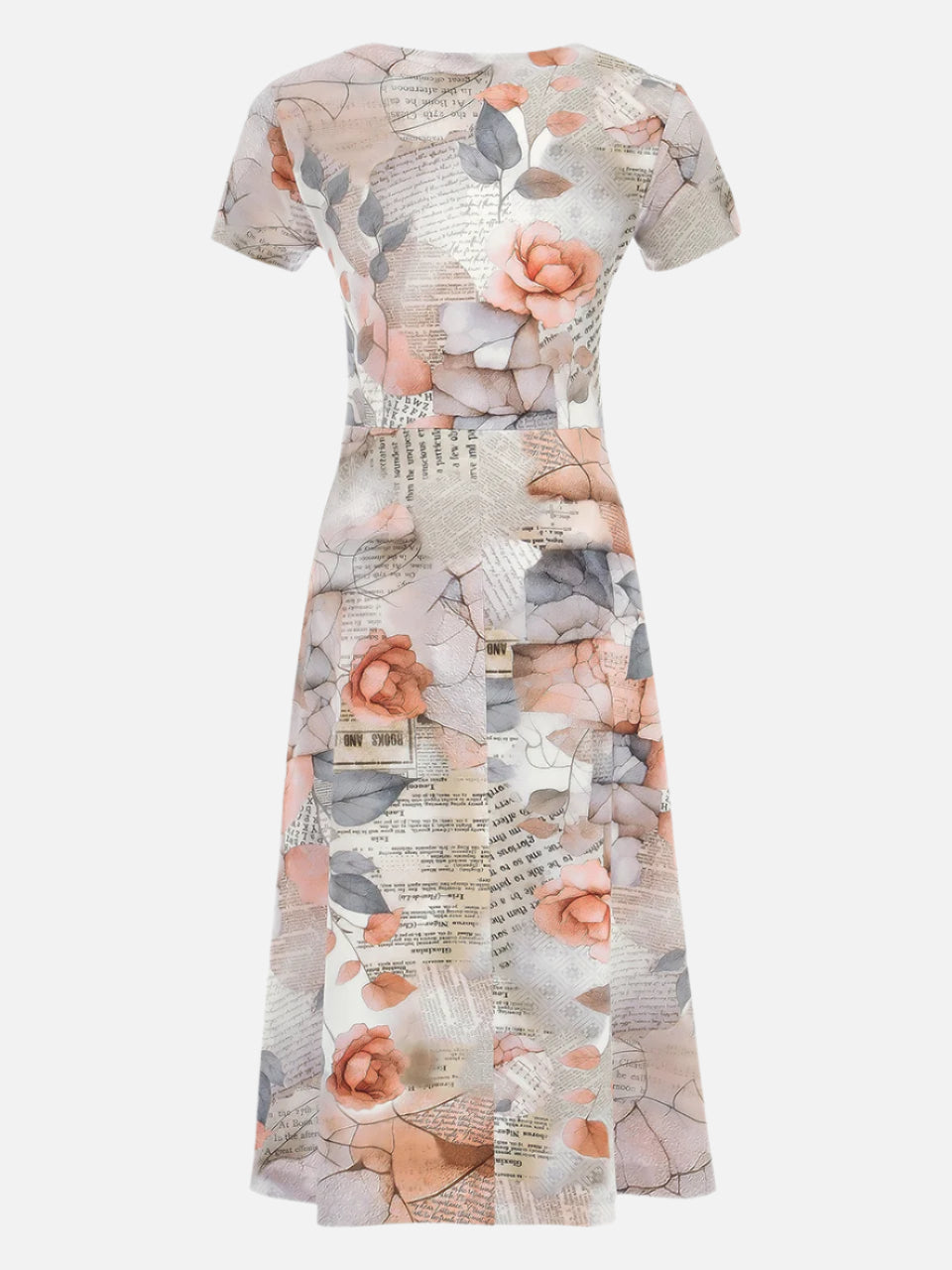 The beautiful floral print dress by Dolcezza is styled in the exclusive "Quiet Rose" abstract print with a flattering scoop neckline and short sleeves.