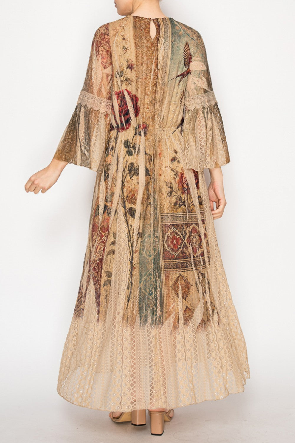 Immerse yourself in the modern boho vibe of the long dress featuring a distinctive floral and bird sublimation print design with a V-neckline and crochet accented sleeves and waist, that flow into a wispy A-line skirt.