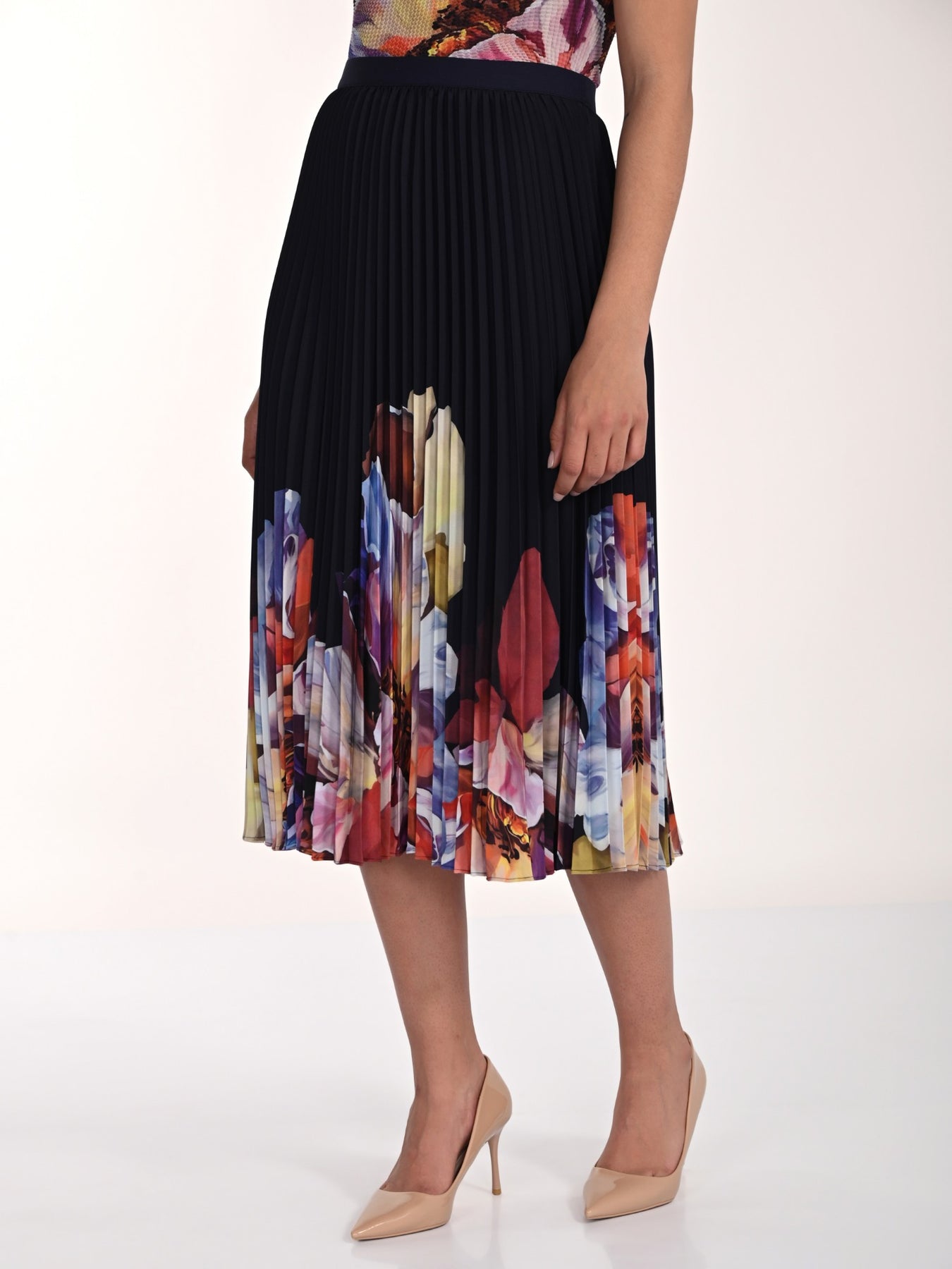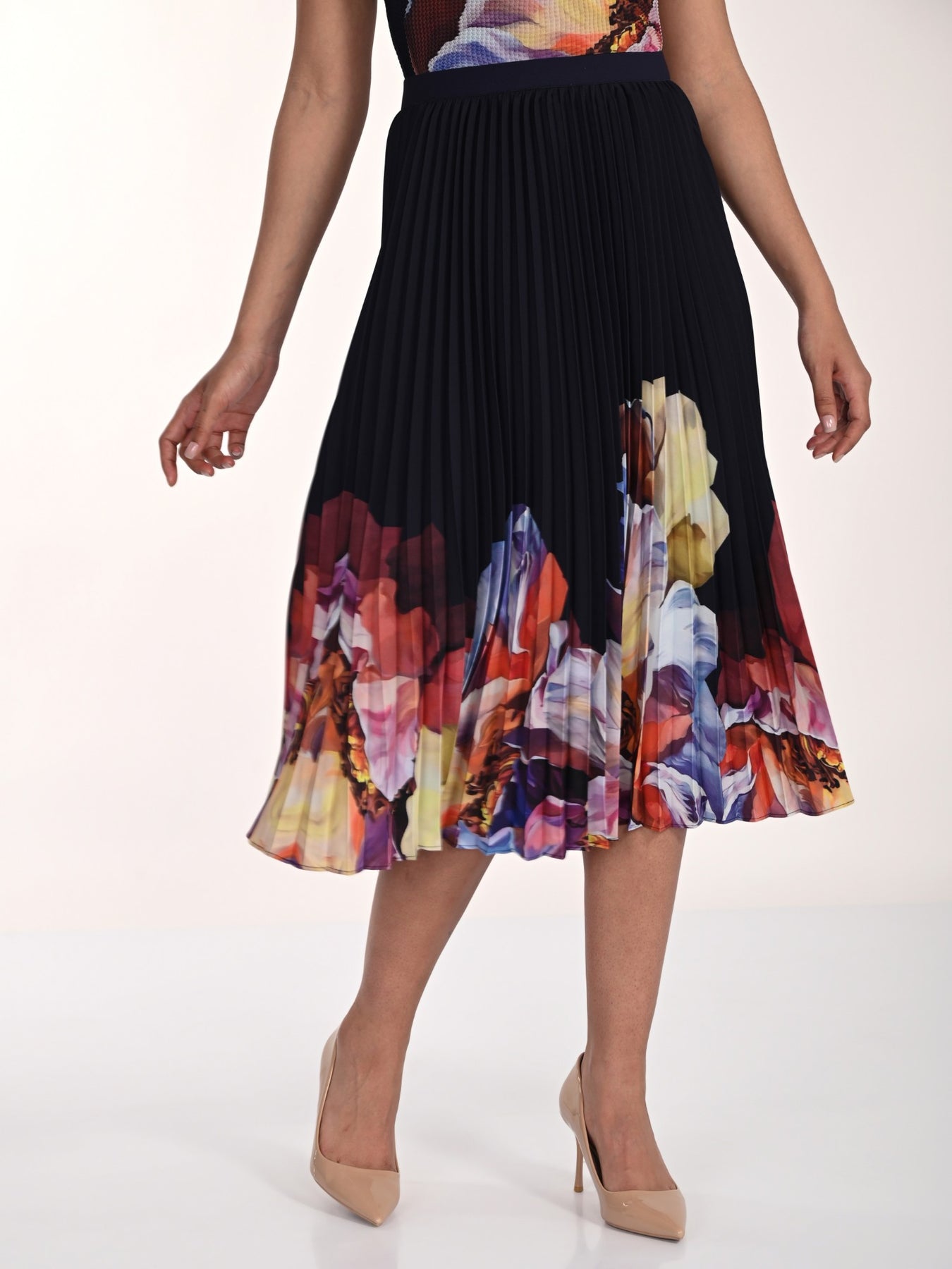 Add a little flair to your wardrobe with the skirt by Frank Lyman that features a dramatic and vibrant large floral print, styled in a lightweight pleated fabric that flows and moves with you.