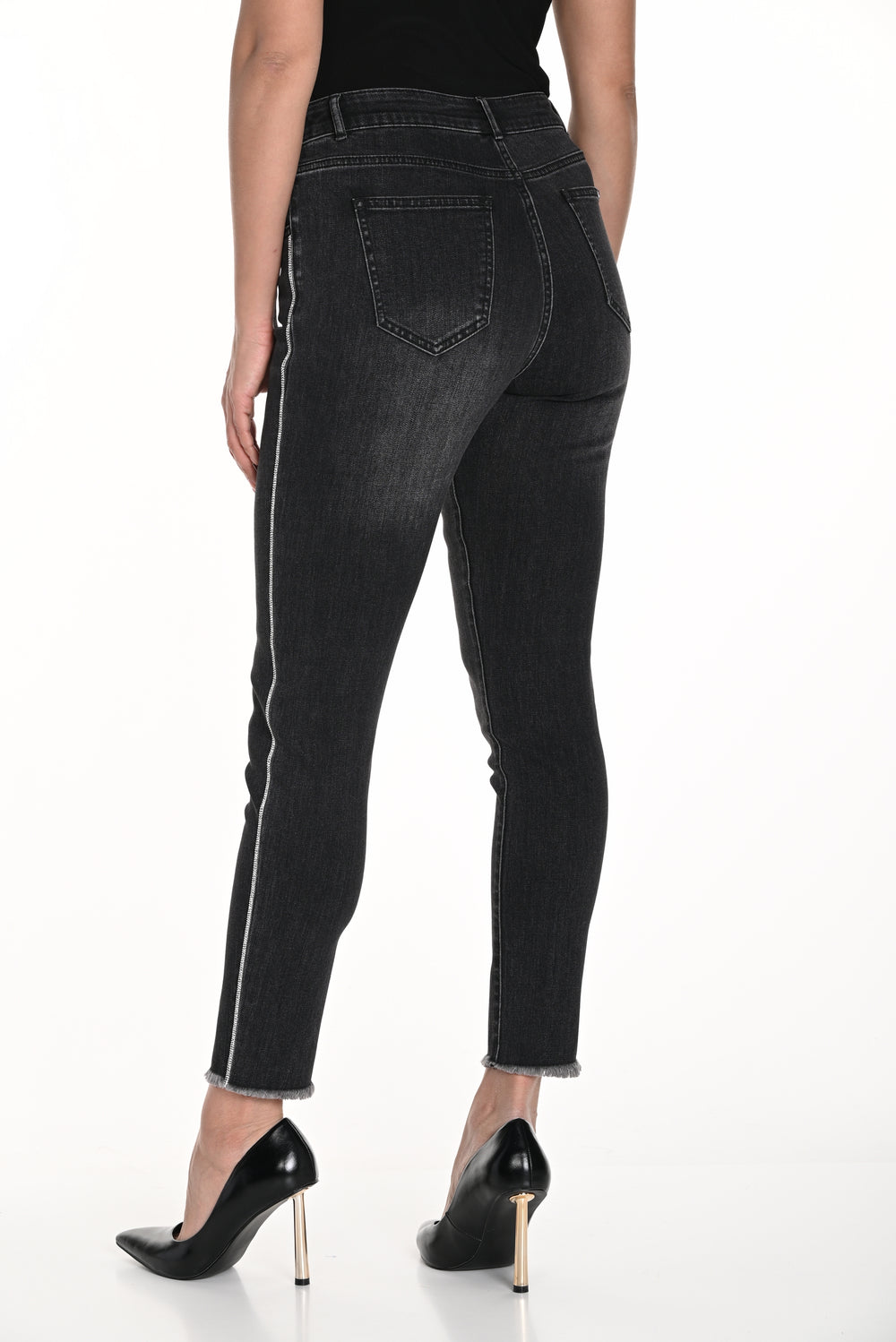 Sophisticated jean from Frank Lyman features elegant rhinestone embellished side seams, with an ankle length slim leg and a stylish frayed hem.