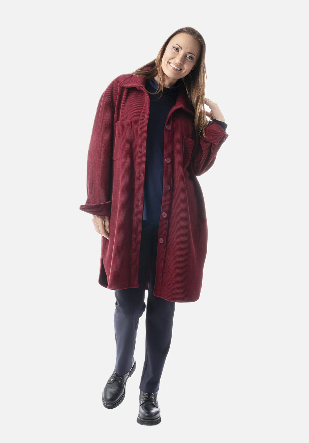 Fashionably casual and super comfortable shirt jacket from Pure Essence is styled in a soft and luxurious corduroy knit fabric with a button up front closure, front patch pockets and long sleeves.