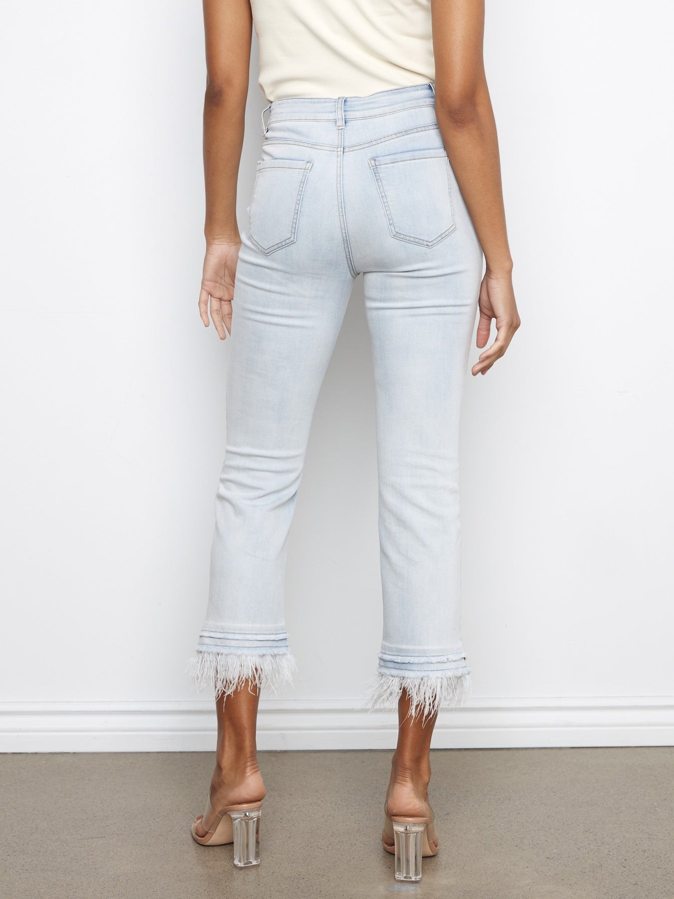 Superb fitting jean from Charlie B is designed with a cropped flare leg that features a double layer frayed edge hem with detachable feather trim for a fashionable touch.