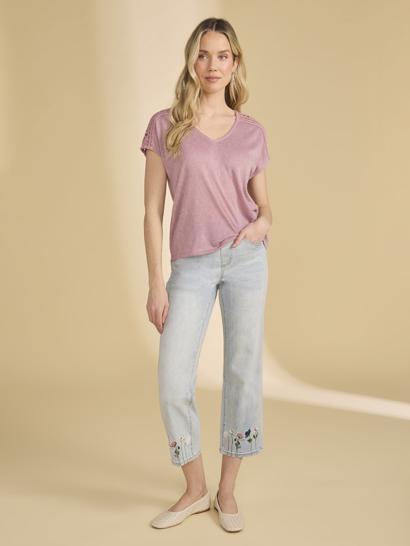 Spring is in full bloom with the cropped straight leg jean by FDJ French Dressing featuring adorable colourful embroidered flowers at the hem and on the back pocket, with a pull-on comfort waistband offering a perfect fit.