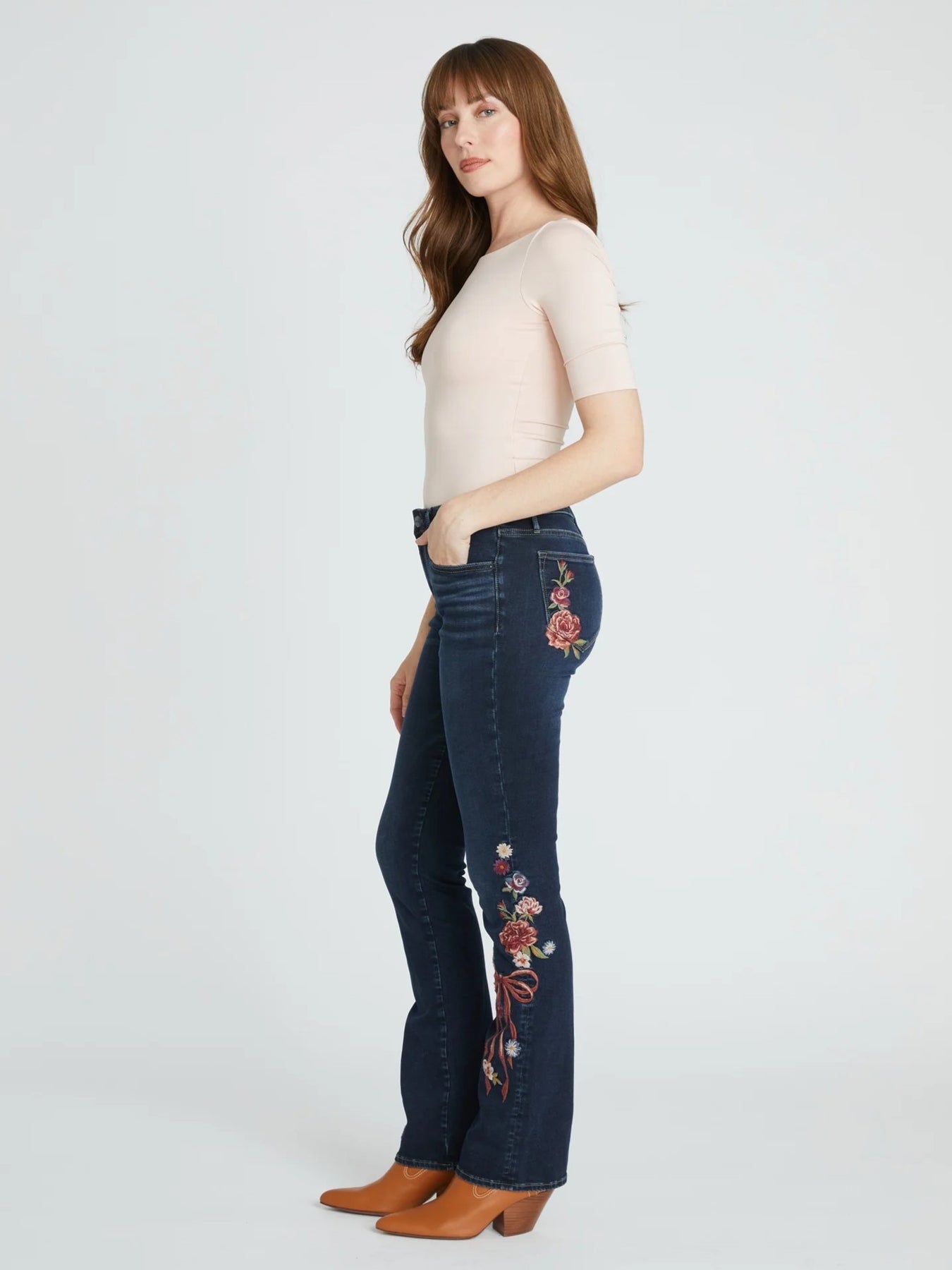 Make a statement with the stunning Kelly boot cut jean featuring romantic intricate bows and roses embroidery that adds a unique touch, in rich burgundy and soft pink tones.