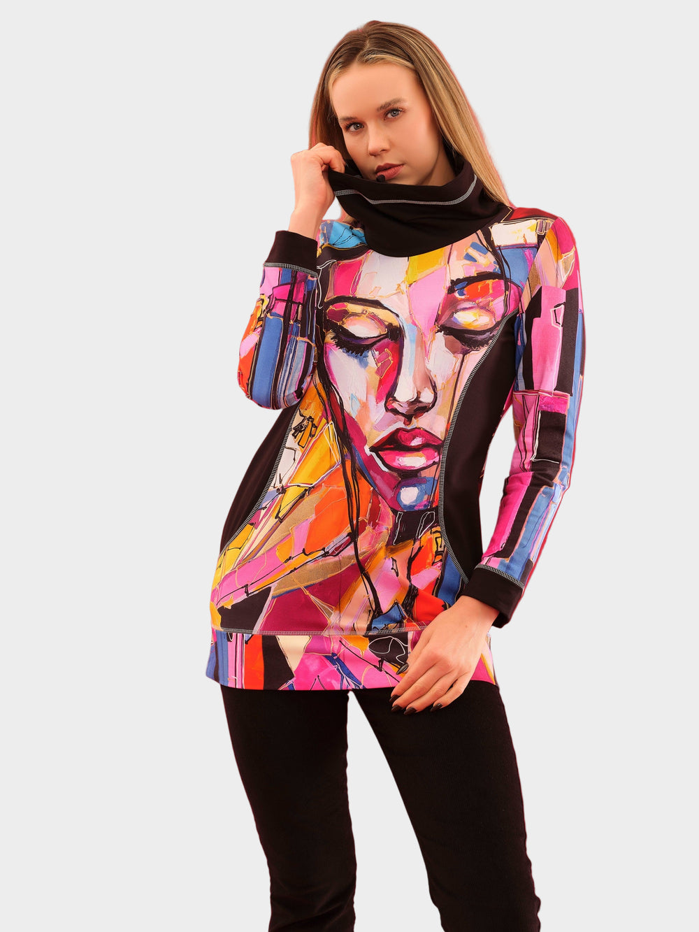 Bold and vibrant tunic top from Dolcezza features an artistic abstract face print with a contrast black soft cowl neckline, slimming black side inserts and long sleeves with black cuffs.
