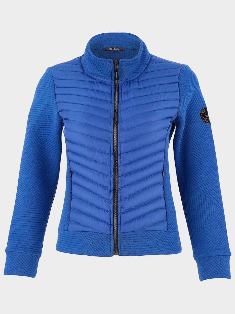 Sophisticated and sporty stretch knit jacket by Dolcezza is styled in a mixed lines jacquard pattern and features puff quilted front panels to keep you cozy.