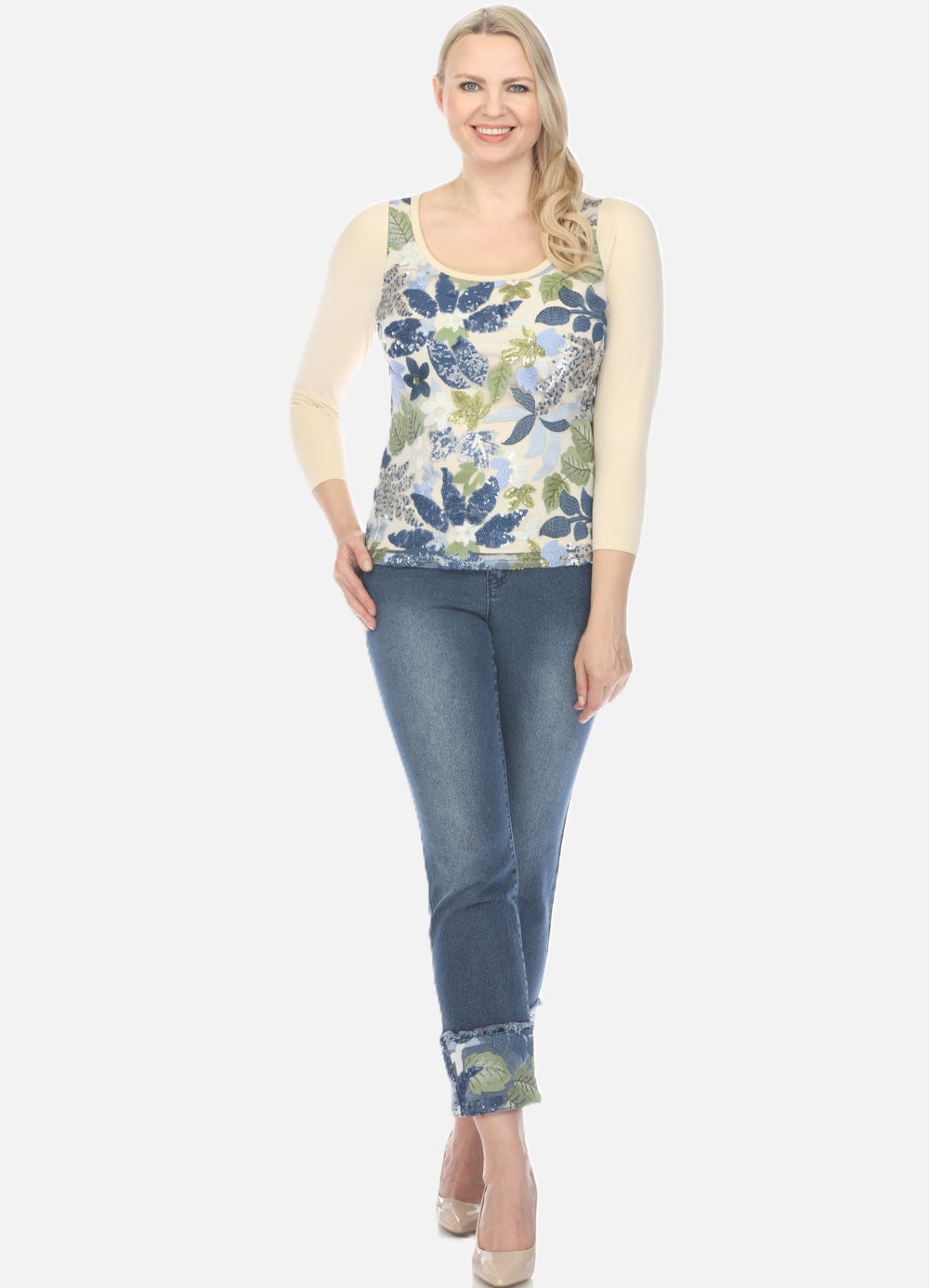 The Daffy top features an all-over floral sequin design on a soft and stretchy luxurious knit with a scoop neckline and solid sleeves.