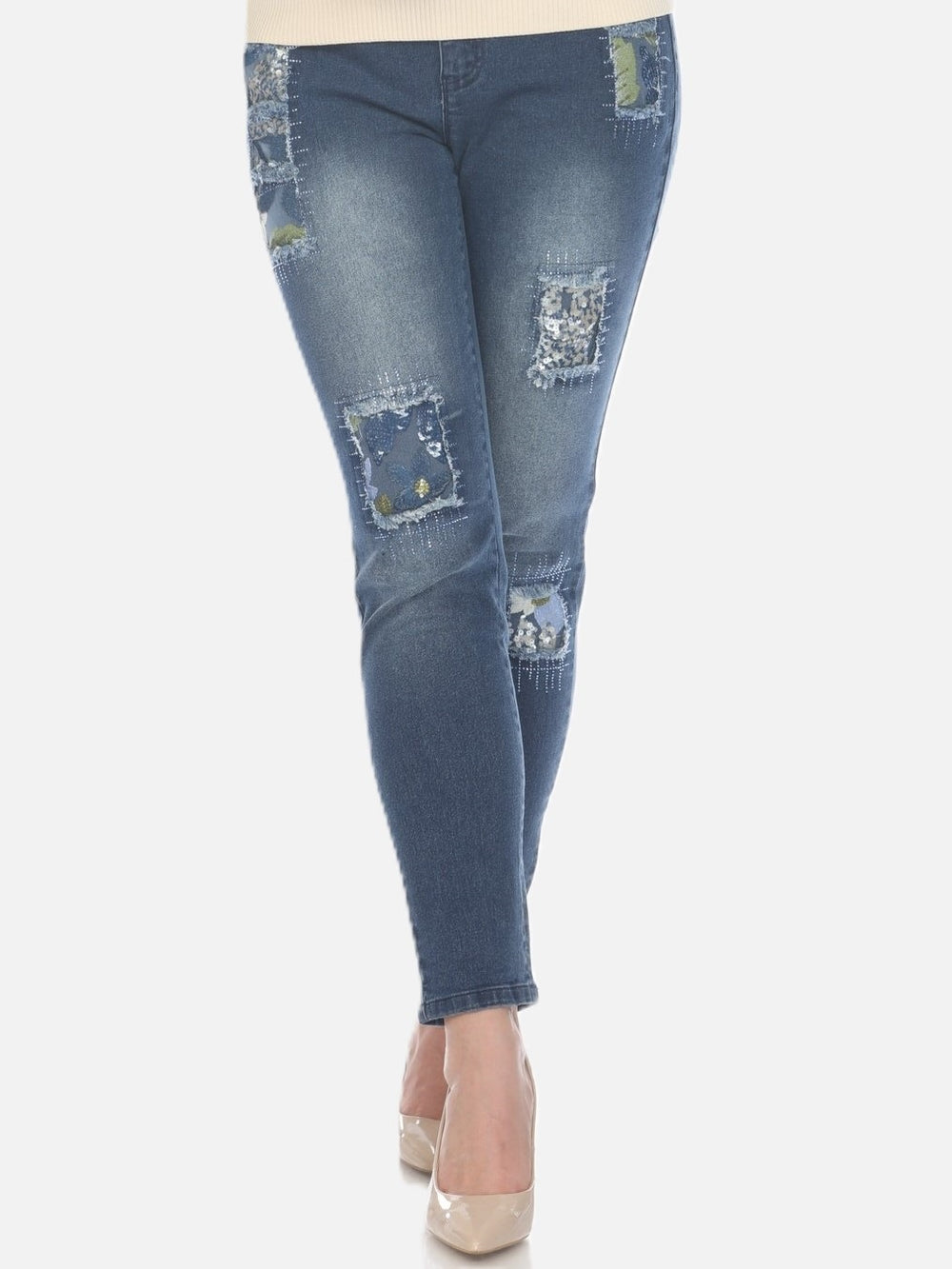 The fashionable Dee jean features sequin floral patch details on a super soft and stretchy premium denim in a medium blue wash.