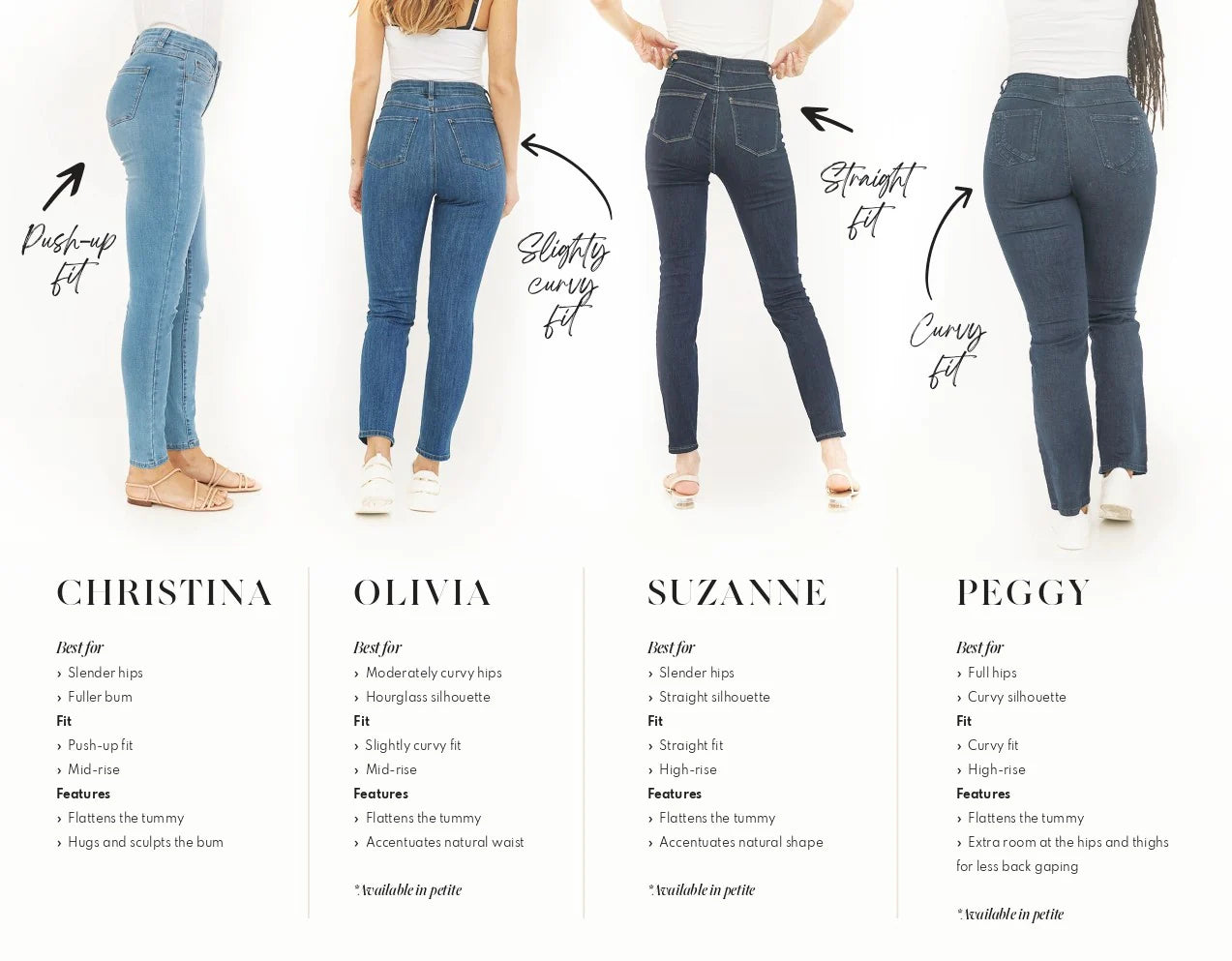Discover the ideal pair of jeans for your unique style and shape. Our denim fit guide breaks down FDJ's four essential styles, helping you choose the perfect fit for every occasion