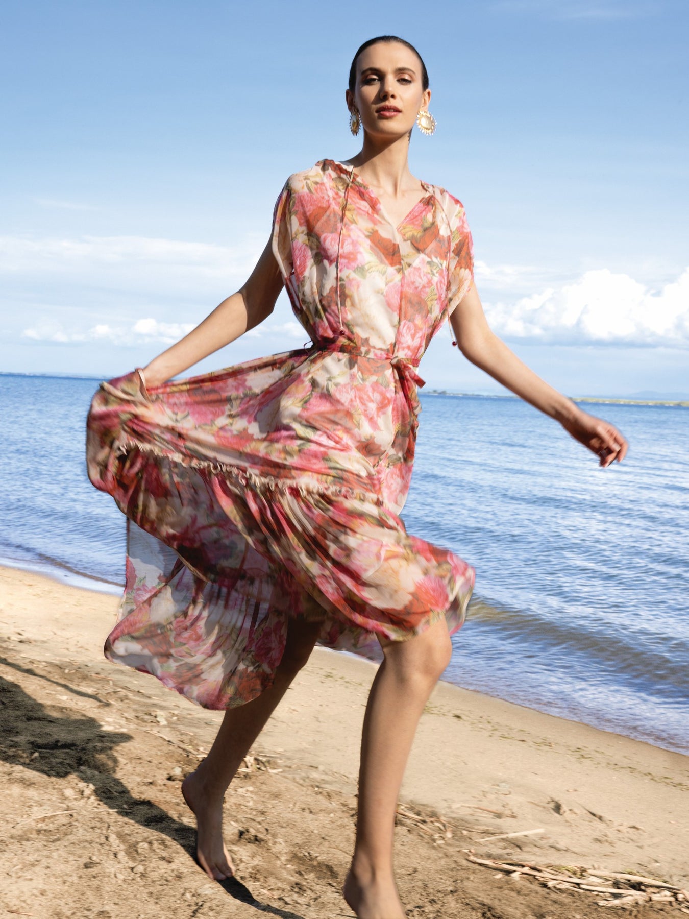 The dress has a notched V-neckline with string ties and cap sleeves with an adjustable self tie belt that enhances the waist, while the lightweight fabric offers an airy and comfortable feel making this dress perfect whether for travel, daytime or elevated for an occasion.